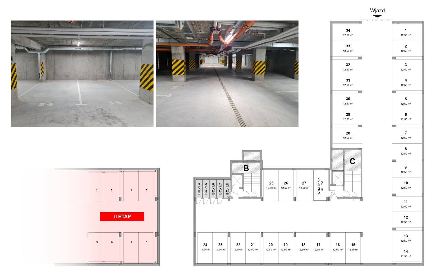 Kondygnację podziemną stanową dwie osobne hale garażowe zawierające 57 miejsc postojowych. Gwarantuje to bezpieczeństwo i komfort parkowania niezależnie od warunków atmosferycznych. Dodatkowo, 59 miejsc parkingowych przed budynkiem zapewniających wygodę dla gości i mieszkańców, eliminując problem z parkowaniem w centrum miasta.