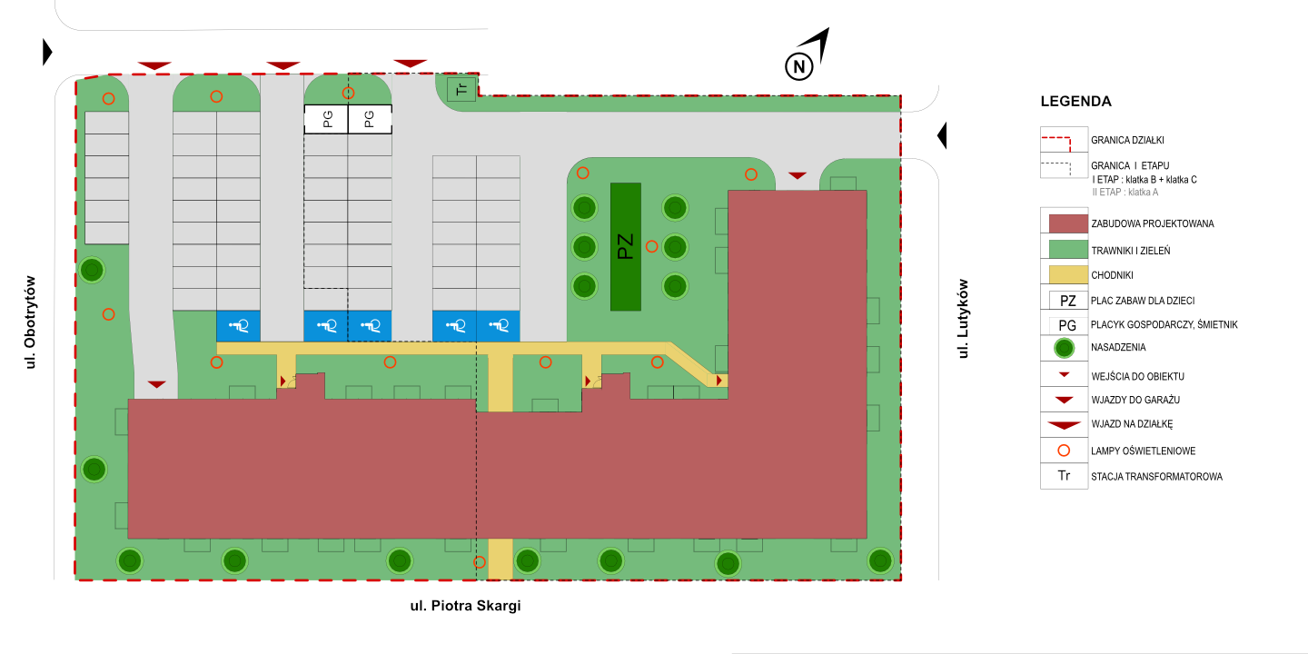 Teren wokół budynku zostanie zagospodarowany nasadzeniami i zielenią, tworząc przyjazną i relaksującą atmosferę. Projekt zagospodarowania obejmuje m.in. nasadzenia ozdobnych krzewów i drzew, ciągi jezdne i piesze, a także oświetlenie terenu. Dla najmłodszych mieszkańców powstanie mały plac zabaw wyposażony w bezpieczne i certyfikowane urządzenia, zapewniający atrakcyjną przestrzeń do zabawy i integracji.